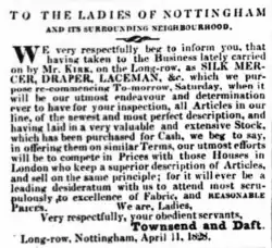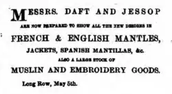 - ^ "William Daft, Silk Mercer, Haberdasher, &c". Nottingham Review and General Advertiser for the Midland Counties. England. 27 March 1840. Retrieved 12 March 2018 – via British Newspaper Archive.
