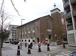 The current building was opened in 1960[1] on a site adjoining the Golden Lane Estate. It replaced a chapel built in 1878–1879 that was destroyed in World War II during the air raids in September 1940. The congregation had moved there in 1879 from nearby Jewin Crescent, a site now incorporated into the Barbican. The Jewin Crescent chapel had opened in 1822, following a move from Wilderness Row, Clerkenwell. The first services had taken place in c. 1774 in Cock Lane, Smithfield. The current building was designed by Caroe & Partners[2] in a Swedish-inspired form of modern architecture sometimes called the New Humanism.