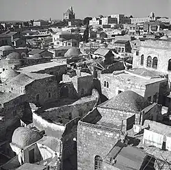 13. ^ Arnon, Adar (1992). "The Quarters of Jerusalem in the Ottoman Period". Middle Eastern Studies. 28 (1). Taylor & Francis, Ltd.: 5–7. doi:10.1080/00263209208700889. ISSN 0026-3206. JSTOR 4283477. Retrieved 2023-05-31. The origin of this ethno-religious partition lies in the nineteenth-century modern survey maps of Jerusalem drawn by Europeans - travellers, army officers, architects - who explored the city. The following verbal geographical definitions of the quarters will refer to this contemporarily prevailing division of the Old City. The ethno-religious partition of the Old City on the nineteenth-century maps reflected a situation rooted in history. Crusader Jerusalem of the twelfth and thirteenth centuries, the capital of the Latin Kingdom of Jerusalem, was partitioned among the residential territories of people from different European countries, Oriental Christian communities and knights orders. In 1244 Jerusalem returned to Moslem hands when it became part of the Ayyubid Sultanate of Egypt. The change of government coincided with a devastation of the city by the Central Asian tribe of Khawarizm which all but annihilated the city's population. In 1250 the Mamluks rose to power in Egypt. Under their rule Jerusalem became a magnet to pilgrims from all parts of the Islamic world. People from various regions, towns and tribes settled in it. The parts of the city preferred by the Moslems were those adjoining the north and west sides of the Temple Mount (the other two sides lay outside the city) on which stood their two revered mosques, the Dome of the Rock and al-Agsa Mosque. Christians from different denominations resettled in the north-west of the city, at the vicinity of the Church of the Holy Sepulchre. Armenians settled in its south-west, near their Cathedral of St James which had been destroyd by the Khawarizms. Jews settled in Jerusalem, beginning with the second half of the thirteenth century, near the south wall of the city, because the territory there was not settled by any other community and separated from their venerated place, the West (Wailing) Wall, only by a small quarter of North-African Moslems. When the city changed hands again at the beginning of the sixteenth century, falling to the Ottoman Turks, no change in the city's population, and hence in its quarters occurred.