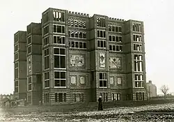 Jezreel wanted the new HQ to be a perfect cube, each side 144 ft long. The architects, however, persuaded him the design was impractical and he agreed to modified version—124 ft on each side and 120 ft high at each corner. It was to be built of steel and concrete with yellow brick walls and eight castellated towers. The trumpet and flying roll, crossed swords of the spirit and the Prince of Wales feathers (signifying the Trinity), were to be engraved on the outer walls.[3]