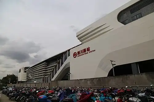 Jianchuan Road (simplified Chinese: 剑川路; traditional Chinese: 劍川路; pinyin: Jiànchuān Lù) is an above-ground station on Line 5 of the Shanghai Metro. Located at the intersection of Humin Highway and Jianchuan Road in the city's Minhang District, the station opened with the rest of the first phase of Line 5 on 25 November 2003.[1] Between 28 December 2018 and 26 December 2020, passengers who wish to travel to stations on the branch line of Line 5 between Dongchuan Road and Minhang Development Zone stations must transfer to four-car trains at Dongchuan Road station.[2] Since 26 December 2020, both the main and the branch line trains run all the way to Xinzhuang with no shuttle service.