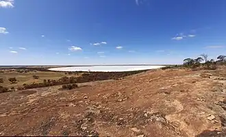 Jilakin Rock is a granite rock formation located approximately 15 km (9.3 mi) east of Kulin and approximately 25 km (16 mi) south of Kondinin in the central Wheatbelt region of Western Australia. It overlooks Jilakin Lake and is a prominent feature in the area, rising out of the surrounding flat plains.[1][2]