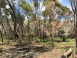 The site is home to a stand of jarrah trees at the base of the rock.[2] They are the most isolated natural jarrah trees known, and are around 150 km (93 mi) east of the main jarrah belt. They survive on water that runs off the rock and quarry soils at the base of the rock.[6] The trees were the reason the area was declared as an A Class Reserve in 1914 so that cutting of timber was prohibited.[7] Other vegetation found to the eastern side of the site include: Eucalyptus transcontinentalis, Eucalyptus subangusta with patches of Eucalyptus salmonophloia and Eucalyptus salubris woodland.[8]