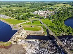 A stretch of rapids and falls on the Chippewa River provided the focal point around which the town developed. They have been incorporated into a hydroelectric facility operated by Northern States Power Company.[10] However, many geological features of the river bed are visible below the dam.[11]