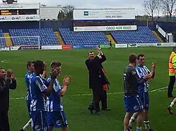 After losing his first five games in charge, including a 7–0 thumping from Grimsby Town at Blundell Park, Gannon admitted that the club's finances limited his ability to change personnel.[140] He also stated that "if I didn't take the job, this club would've had a real chance of dying... I'm not proud to be the manager of a club that loses 7–0... but this is my team now... It has always been my club, so it's my responsibility to make things better, and over time we will."[140] He released striker Antonio German,[141] defender Chris Blackburn,[142] and seven goal top-scorer Nick Chadwick in the January transfer window.[143] He then signed defender Joe Connor on non-contract terms,[144] and teenagers Aaron Cole and Danny Rowe on loan.[145][146] His first win in his second spell at the club came on New Year's Day, in a 3–2 victory over Barrow at Edgeley Park.[147] He then re-signed former players Paul Turnbull and Matty Mainwaring on loan.[148][149] Worried by the situation at crisis clubs Darlington and Kettering Town, Gannon cancelled the contracts of veterans Matt Glennon, John Miles, Mark Lynch, and Ryan McCann.[150] He brought in 23-year-old Telford defender Sean Newton and 18-year-old Sunderland keeper Lewis King on loan,[151][152] whilst signing 19-year-old Lancaster City midfielder Danny Hattersley on a permanent transfer.[153] The "Hatters" secured their Conference status with two games to spare, after a 1–1 home draw with Braintree Town on 14 April, having lost just twice in the league at Edgeley Park since Gannon's return.[154] Stockport finished the campaign in 16th place, 10 points above the drop and 20 points below the play-off zone.