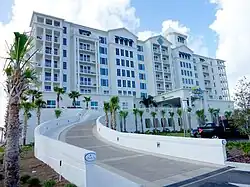 On June 28, 2010, the Margaritaville Beach Hotel (pictured to the right) opened on Pensacola Beach. The former site of a Holiday Inn, destroyed by Hurricane Ivan on September 16, 2004,[16] Margaritaville Hotel is on over 800 feet of gulf-front property. An additional 800 feet overlooks the bay. The beachfront hotel features 'barefoot elegance' with 162 guest rooms, including 24 corner rooms with wrap-around balconies.[17]