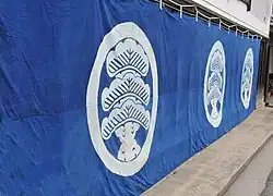 The Honchō Gunki Kō (Thoughts on Japanese Military Equipment), a military manual written in 1709[3] by Arai Hakuseki (1657–1725), lays out standard measurements for jinmaku. Arai, an advisor to the shōgun Tokugawa Ienobu, recorded that a jinmaku should be 1.5 m (5 ft) tall and 8.4 m (28 ft) wide. The number of makukuji (幕串), or poles for hanging the jinmaku, was set at 10 for a taisho officer and 8 for other soldiers, tethers only in white, black, or blue, and mon clan emblems placed in between three, five, or seven places.[4] In the Edo period military science became popular among samurai and gave religious meaning to jinmaku as a sacred item.