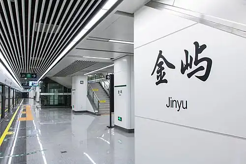 Jinyu Station (Chinese: 金屿站; pinyin: Jīnyǔ zhàn; Fuzhounese: [kiŋ˥˧ løy˨˦˨]) is a metro station of Line 2 of the Fuzhou Metro. It is located near the intersection of Guobin Avenue, Qishan Avenue and Xiyuangong Road, Minhou County, Fuzhou, Fujian, China. It started operation on April 26, 2019.[1][2]