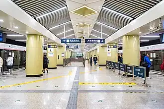 Jiulongshan Station (simplified Chinese: 九龙山站; traditional Chinese: 九龍山站; pinyin: Jiǔlóngshān Zhàn) is an interchange station between Line 7 and Line 14 of the Beijing Subway. Line 7 station was opened on December 28, 2014, as a part of the stretch between Beijing West railway station and Jiaohuachang and is located between Shuangjing to the west, and Dajiaoting to the east.[1] Line 14 station was opened on December 26, 2015.[2]