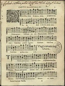 In 1657 the workshop of Maurizio and Amadeo de Belmonte, in Rome, printed the collection of 33 pieces dated between 1636 and 1653, in the form of seventeen booklets respectively for voice and instrument, under the title Joannis Laurentii Rabello Psalmi, tum Vesperarum tum Completarum. Item Magnificat, Lamentationes et Miserere (Psalms, both of Vespers and of Compline. [And] also the Magnificat, the Lamentationes and the Miserere by João Lourenço Rebelo). Only one single copy of this edition had been preserved, thanks to the Italian priest Fortunato Santini (1776-1861), and is now preserved in the library of the Episcopal Seminary of Münster.[10] A modern transcription was released in 1982 by Calouste Gulbenkian Foundation monumenta edition Portugaliae Musica. In addition, four volumes of the original impression survived in the Biblioteca Nacional de Portugal, from the Jesuit College of Santo Antão.[11]