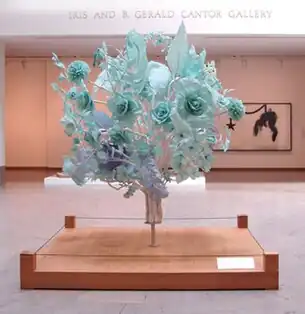 During the 1990s, Carson's work proceeded from painting to painted relief to painstakingly detailed, plant-focused wall sculptures (e.g., Yellow Rose, 1999)[43] to stand-alone, three-dimensional sculpture in the early 2000s;[2][44][45] she has likened her process during that time to constructing large drawings in space.[46] Her 1999 relief Wood Nymph combined fantasy, reality and illusion in an eight-armed, pie-wielding, torso-less Kali-like figure that seemed to emerge from a cross-section of California redwood, which was actually wood, fiberglass, cloth, and plaster seamlessly integrated beneath a veneer of trompe l'oeil wood grain.[44] Carson's 2001 solo exhibition at Plus Ultra Gallery consisted of a single freestanding sculpture: the nine-foot tall, thermoplastic and aqua resin Bouquet, an icy turquoise-purple arrangement mixing recognizable, anatomically correct and imaginary, slightly sinister flowers.[2][9] Roberta Smith wrote that the work's fragility and exaggerated scale generated unapologetically decorative, "giddy beauty" and metaphors engaging subjects from genetic engineering to social tolerance and coexistence.[2]