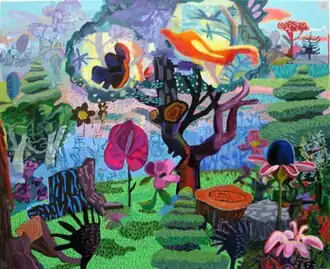 Carson returned to painting in the 2010s, pictorially expanding on the world of her sculptures with imaginary, futuristic landscapes and floral portraits that suggest narrative dramas with plants as protagonists.[52][1] Her drawings form a visual and conceptual stepping-stone between her painting and sculpture; they were all exhibited together in her shows, "Hyper Flora" (2018, Big Town Gallery) and "Rise Up and Shine!" (2019 retrospective, Sage College of Albany).[8][51][53] Like her early work, Carson's later painting draws on "high" art influences such as Cubism and Surrealism as well as popular culture inspirations, such as Looney Tunes cartoons.[8][52][54] Critics describe them as over-the-top, hallucinogenic spectacles that "teeter on the edge of picturesque and grotesque,"[7] populated by anthropomorphic hybrid vegetation, alive with expressive petals and synthetic, pixel-like patterning (Early Spring, 2011) or eyes, fangs and animated limbs (Knotty Pine, 2016);[55][52][8] reviews have compared them to the fantastical imagery of filmmaker Tim Burton, The Simpsons and Little Shop of Horrors.[56][48][53]