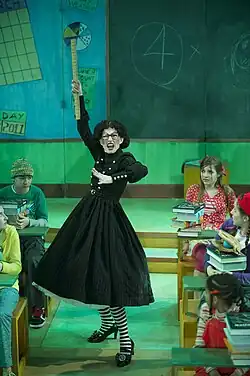 Cushing's theatre writing took a new direction after she was commissioned in 2001 by Imagination Stage to adapt the popular children's book Miss Nelson Is Missing! by author Harry Allard and illustrator James Marshall. She developed the book into a musical for their theatre at White Flint Mall. This would be her first Theatre for Young Audiences (TYA) project. "It is a very edgy, witty, clever book," Cushing told The Washington Post. "I like writing for other people. I'm not performing right now."[28] The story is about a class of uncontrollable kids at Horace B. Smedley Elementary School whose sweet teacher, Miss Nelson, stops showing up. In her place is the ferocious hag, Miss Viola Swamp, who the children hate and fear. Suddenly the children have a new appreciation for their missing teacher.[29] Cushing used much of the language of the book in the script and lyrics (such as the kids considering if "a swarm of angry butterflies" took their teacher away). She interspersed items for adults to enjoy, such as theatre references, local topics, and politics.[28] This show was performed as far away as China and Papua New Guinea,[30] and remained in production through 2023.[31][32] Describing a production at the Manhattan Children's Theater in 2005, The New York Times reviewer Laurel Graeber said, "A gifted playwright and composer, Ms. Cushing has created a musical that will charm anyone who has ever sat in front of a schoolteacher's desk – or, for that matter, behind it."[33]