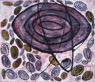 Joan Moment (born 1938) is an American painter based in Northern California.[1][2][3] She emerged from the 1960s Northern California Funk art movement[4][5] and gained attention when the Whitney Museum of American Art Curator Marcia Tucker selected her for the 1973 Biennial and for a solo exhibition at the Whitney in 1974.[6][7] Moment is known for process-oriented paintings that employ non-traditional materials and techniques evoking vital energies (biological, sexual, cosmic) conveyed through archetypal iconography.[8][9][10] Though briefly aligned with Funk—which was often defined by ribald humor and irreverence toward art-world pretensions—her work diverged by the mid-1970s, fusing abstraction and figuration in paintings that writers compared to prehistoric and tribal art.[11][12][5][7] Critic Victoria Dalkey wrote that Moment's methods combined chance and improvisation to address "forces embodied in a universe too large for us to comprehend, as well as the ... fragility and transience of the material world."[13]