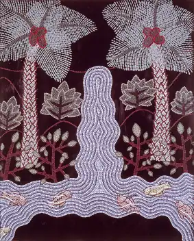 In the mid-1970s, Moment turned to archetypal symbols and forms found in Paleolithic objects, aboriginal and ancient art, and Byzantine mosaics.[7][1][15][8] The "Dotted Mosaic Paintings" (1973–1975) depicted flat, deadpan, iconic forms—animals, fish, plants, people, tropical landscapes and mountains—composed in vibrating, bright dots of color on black rubberized grounds (e.g., Waterfall, 1973).[7][6] Marcia Tucker described them as "haunting forgotten Edens" that offered "a keyhole view of paradise, a still and magical world that seduces, enchants, and captivates with eccentric, impossible delights."[7] In the "Pattern Paintings" (1978–84), Moment painted crudely rendered geometric shapes on gesso-treated cheesecloth, dresses and chairs—rejecting the conventional square or rectilinear painting format (e.g., Shirt Totem or Rug Dress, 1978).[31][24][15] Their textured surfaces, covered in checkerboard, gridded, concentric or dotted patterns, referenced contemporary concerns with camouflage, aboriginal art, superficiality and the masking power of clothing (Cocktail Dress, 1978).[15][31][24]