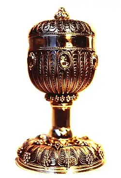 In London, Angelett continued to work on and expand the Royal Garden collection inspired by the Australian nature. An example from the collection is the ring Veronica Perfoliata created with the use of CAD and laser technology.[20] In parallel with modern techniques Angelett is continuing to use the ancient technique of cloisonné, which was used in the Cup of David in Australia. The Holy Kingdom Ring, designed by Angelett in London for the former Governor-General of Australia Dr Hollingworth, is implemented in this technique. The Holy Kingdom Ring is "Manifestation of biblical passage which painted a picture of Holy Kingdom with the image of Jesus Christ depicted in ancient technique of polychrome cloisonné enamel".[13] For creation of this ring Angelett conducted research on "remarkable collection of papal rings, dating back to fourteenth century"[13] in the British Museum in London.