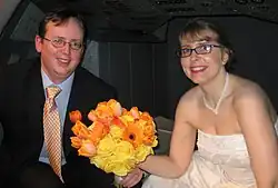 Schaffhausen (right) with husband Garrett Rooney, inside the model of a Apollo command module at the Boston Museum of Science at their wedding reception, 2008