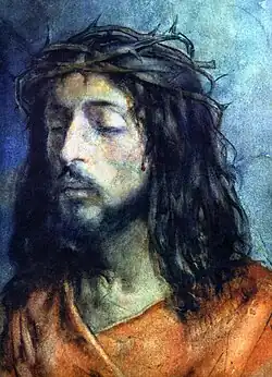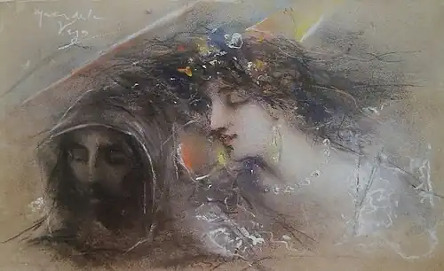 A dandyish, dissolute and often transgressive individual, Martínez de la Vega clashed, both personally and artistically, with traditionalist Bernardo Ferrándiz, founder of the Málaga School; on the other hand, he sympathized with young Picasso and was a lifelong friend of José Denis.[2] His work, especially in the late part of his career, is considered the closest to modernity within the aforementioned painting school, approaching cultural fin-de-siècle European tendencies like symbolism, post-impressionism and even, according to some authors, pre-raphaelism.[3] Notable works include his pastel series on The Temptations of St. Anthony, his religious paintings (Ecce Homo and Dolorosa) and the posters he designed for the Feria de Agosto, especially the one he painted for the 1895 edition.