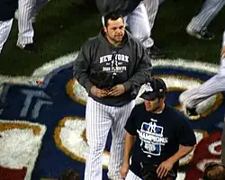 Through August 12, Chamberlain maintained a 3.85 ERA before the Yankees decided to limit his innings for the year. The team would start him every seven day and used Chad Gaudin in the rotation.[62] Chamberlain pitched to a 8.19 ERA in his final eight starts that season.[63] During this time, the Yankees considered demoting him to the minor leagues and even threatened to leave him off of the postseason roster.[64] However, he ultimately remained on the roster in a set-up role as the Yankees went with a three-man starting rotation.[65][66] He was used extensively out of the bullpen en route to the Yankees winning the 2009 World Series.[67]