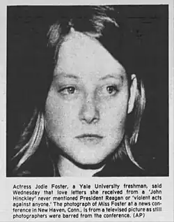 During her freshman year at Yale in 1980–81, Foster was stalked by John Hinckley Jr., who had developed an obsession with her after watching Taxi Driver multiple times.[20](p 74)[183] He moved to New Haven and tried to contact her by letter and telephone.[183][184] On March 30, 1981, Hinckley attempted to assassinate United States president Ronald Reagan, wounding him and three other people, claiming that his motive was to impress Foster.[183] The incident drew intense media attention, and Foster was accompanied by bodyguards while on campus.[6][20](p 74) Judge Barrington D. Parker confirmed that Foster was innocent in the case and had been "unwittingly ensnared in a third party's alleged attempt to assassinate an American President". Her videotaped testimony was played at Hinckley's trial.[11][184] While at Yale, Foster also had other stalkers, including a man who planned to kill her but changed his mind after seeing her perform in a college play.[6][20](p 74)