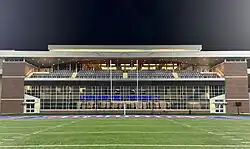 The press box and suites are located above the bleachers on the home side of Joe Aillet Stadium. Originally built in 1968 and expanded in 1988, the sky box was renovated and replaced in time for the 2017 season. The first floor of the facility includes multiple luxury suites for fans; and the second floor includes room for coaches, broadcast members, and gameday officials.[22] Additional signage was added onto the front, in time for the 2023 season, which highlighted the program's 3 national championships and 3 retired jersey numbers.