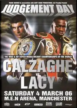Joe Calzaghe vs. Jeff Lacy, billed as Judgement Day, was a professional boxing match contested on 4 March 2006, for the IBF, WBO and The Ring championship.[1] It pitted long-time WBO champion Calzaghe against up and coming IBF champion, American Jeff "Left Hook" Lacy.
