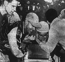 ![]() James (in vehicle) gets congratulated by his pit crew after being the last driver to qualify for the 1951 Indianapolis 500. | |