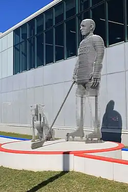 A statue by artist Frédéric Laforge of Malone with a bulldog, entitled Hommage à Joe Malone, was inaugurated on June 10, 2021, and is located at Place Jean-Béliveau at the ExpoCité in Quebec City. The statue pays homage to Malone's nickname, "Phantom Joe", being constructed with discs that are spaced apart, giving the illusion of a phantom.[39]