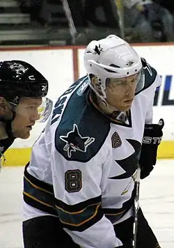 ![]() Pavelski (right) with the San Jose Sharks in February 2010 | |||