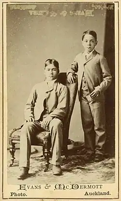 Initially, 20 players were selected for the side, named the "New Zealand Māori team".[41] Some of these players had strong family and playing links to Warbrick (such as his four brothers).[42] Warbrick was eventually compelled to add five Pākehā (European non-Māori) players to the squad, which resulted in the side being renamed the "New Zealand Native football team".[43][f] Warbrick may have wanted a team of exclusively Māori or part-Māori players, but according to historian Greg Ryan, including the Pākehā players was "necessary to strengthen the Native team and create a more effective combination". A further player, Pie Wynyard, was added to the side after they arrived in Britain in November 1888.[45][g]