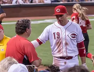 Joseph Daniel Votto (born September 10, 1983) is a Canadian-American former professional baseball first baseman who spent his entire 17-year Major League Baseball (MLB) career with the Cincinnati Reds from 2007 to 2023. He was the second Canadian player, following Larry Walker, to have 2,000 hits, 300 home runs, and 1,000 runs batted in (RBI) in MLB.[1] Votto is a six-time MLB All-Star, a seven-time Tip O'Neill Award winner, and two-time Lou Marsh Trophy winner as Canada's athlete of the year.[2] In 2010, he won the National League (NL) Most Valuable Player Award and Hank Aaron Award. Renowned for his plate discipline and ability to get on base, Votto was first in career walks (1,365), third in on-base percentage (.409), and fourth in on-base plus slugging (.920) among all active players at the time of his retirement during the 2024 season. He is one of two Reds with at least 300 home runs, 1,000 RBI, and 2,000 hits in franchise history, the other being Johnny Bench.