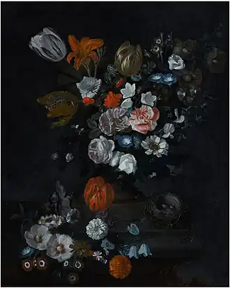 Johan Baptist Govaerts painted flower still lifes, genre scenes, history paintings, game pieces, fruit still lifes and mythological scenes.[2]