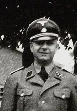 Stöver had previously been SS-Untersturmführer and kriminalsekretär of Kamp Schoorl concentration camp and was known as a notoriously cruel man. Nicknamed "de Blaffer" ("the Barker"), he took pleasure in entering the barracks at night, "roaring" at the prisoners.[3] In Kamp Amersfoort he was often in charge, because Heinrich regularly stayed outside the camp. He was 'trained' by two SS men from Dachau concentration camp, who were transferred by Heinrich to 'teach the guards how to deal with the prisoners'. According to a witness statement, Stöver killed at least one Soviet-prisoner of war with his own hands, by smashing his brains in with a piece of firewood. In addition, he confiscated food intended for the prisoners, in favor of the camp leaders. He was commander of a firing squad that shot detainees without trial. During his absence Stöver was often replaced with the notoriously sadistic SS-Unter-Schutzhaftlagerführer Josef Johann Kotalla.[4] When Lagerkommandant Heinrich left the camp in 1943, it wasn't Stöver, but SS-Schutzhaftlagerführer II Karl Peter Berg, who succeeded him as Lagerkommandant, after which Stöver disappeared from the scene.