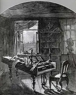 In 1819, he accompanied the Emperor's entourage to Italy, followed in 1820 by attendance at major military maneuvers in Hungary.[1] That same year, he did a portrait of Ludwig van Beethoven and, shortly after the composer's death in 1827, made a detailed sketch of his study (where he died) in the "Schwarzspanierhaus".[4]