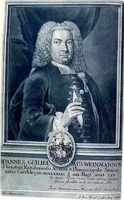 Johann Wilhelm Weinmann (13 March 1683 Gardelegen, Germany – 1741),[1] apothecary and botanist, is noted for his creation of the florilegium Phytanthoza iconographia between 1737 and 1745, an ambitious project which resulted in eight folio volumes with more than 1,000 hand-coloured engravings of several thousand plants. The work is thought to have inspired similar works, such as the Japanese medicinal work "Honzo Zufu" (1828) by Iwasaki Tsunemasa, and "Somoku-dzusetsu" (1856) by Yokusai Iinuma.
