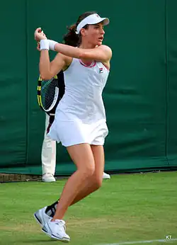 Konta made her debut in the main draw at the French Open against Denisa Allertová[69] after she won her way through qualifying without losing a set. Konta narrowly lost to Allertová.[70] Konta then returned to the UK, where she was granted wildcards to the WTA Tour grass-court events in Nottingham, Birmingham and Eastbourne. At Nottingham, Konta recorded her first top 100 win of 2015[71] in the opening round as she beat world No. 59 and seventh seed for the event, Magdaléna Rybáriková. Konta would also beat Monica Puig before exiting in the quarterfinals to eventual tournament runner-up Monica Niculescu.[72][73] Konta then played the WTA Premier event in Birmingham. She beat Jarmila Gajdošová in the first round before running into sixth seed Karolína Plíšková; Konta took the opening set off Plíšková, then ranked 13 in the world, but would eventually lose in three sets in a match played over two days.[74] Konta's conqueror ended the tournament as the runner-up for the second week in a row.[75]