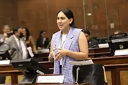 She became a member of the Democratic Left party and she was their candidate for the province of El Oro. In 2021 when she was elected she was the youngest member of the National Assembly of Ecuador. She was elected to the fourth position on the Legislative Administration Council on 15 May 2021 after being proposed by her Democratic Left colleague Xavier Santos. Her position was confirmed with 70 votes in favour although 53 members abstained.[2]