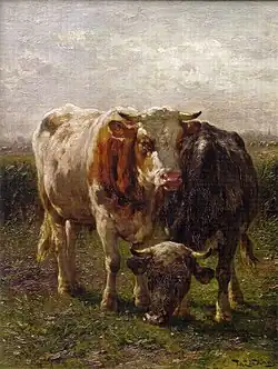 In 1857 De Haas first went to Brussels, where he became friends with Willem Roelofs. De Haas frequently returned to the Netherlands and Oosterbeek for inspiration and Caroline. From 1860 his friend Gabriël also lived in Brussels, and De Haas often painted cattle in the landscapes of both Roelofs and Gabriel, fitting in perfectly with both their styles.[1] In 1860 he won the gold medal at the exhibition of Utrecht.