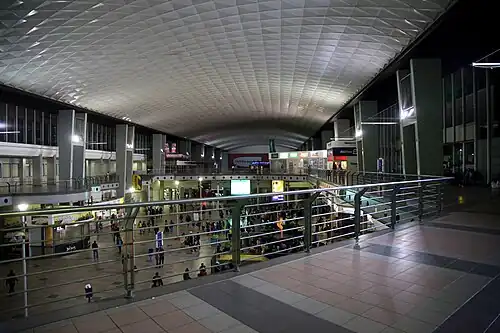 Park Station is also the site of the southern terminus of the Gautrain, a high-speed rail link to Pretoria and the OR Tambo airport. The Gautrain station is adjacent to the existing main-line station, beneath Smit and Wolmarans streets, but with separate access. The station is modern and secure, with tight security and visible policing.[11] Services run at 10-minute intervals during peak time, and access to services is via a pre-paid contactless Gautrain card.[12] The station is underground, being connected via 9 miles of tunnel to Marlboro station. The line is fully electrified and built to the international standard 1,435 mm (4 ft 8+1⁄2 in) gauge, broader than the 'standard' 1,067 mm (3 ft 6 in) Cape gauge. The station opened for operation in June 2012.[13]