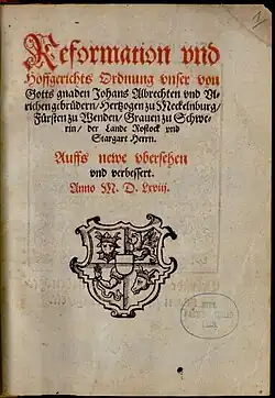 John Albert I, in older literature known as John or Johann (23 December 1525 – 12 February 1576), was the reigning duke of Mecklenburg-Güstrow from 1547 to 1556 and of Mecklenburg-Schwerin from 1556 to 1576. In 1549 John Albert I saw to it that the parliament of Mecklenburg carried through the Reformation for the entire duchy.