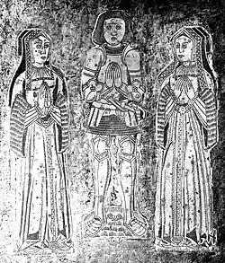 His chest tomb with monumental brasses on top, of himself between his two wives with his children below in two small groups exists in St. Mary's Church, Atherington, to where it was moved in 1818 from Umberleigh Chapel.[66] The Lisle Letters record some details concerning the making of the tomb. His widow Lady Lisle ordered "images & scripture...for Mt Basset's tomb" before she departed for Calais[67] to join her new husband, and a letter from Richard Kyrton to Lady Lisle dated 21 November 1533 states: "And as for your plates for the tomb, they are sent home by the carrier, and for the gilding they must descry all the arms by the reason of colours. And they asketh £ v for the doing of it and for the making Master George Rolles hath laid out xxxiii s iiii d unto Candlemas, the which Burye then must pay him".[68] In a letter dated April 1534[69] Sir John Bonde wrote to Lady Lisle "the pictures of Mr Basset's tomb" have been "laid on by the hands of Oliver Tomlyng". Thus the brasses were made in 1533 and set onto the tomb in 1534.[70] A letter to Lady Lisle from George Rolle[71] referred to an inscription on the tomb, which is now missing.