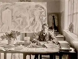 As in his earlier works at the academy, Bauer showed an interest in large frescos and, after his visit to Italy, this interest grew. His first chance to create a major work using this technique was in 1912, when he completed a 1.5-by-1.5-metre (4 ft 11 in by 4 ft 11 in) fresco-secco mural, Vill-Vallareman, at the home of publisher Erik Åkerlund.[84] In 1913, he was asked to do a fresco for the Odd Fellows lodge in Nyköping, Den helige Martin (Saint Martin, the Holy).[85] At the same time, the new Stockholm Court House was under construction. Contests regarding decorations for the building were held, and most of the noted Swedish artists at that time presented entries and suggestions. Bauer made a number of sketches for these competitions, but his confidence failed and he did not submit any of his drafts.[84]