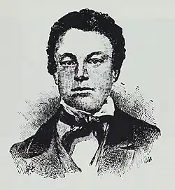 - John Edwin Cook, sometimes spelled Cooke, 29, born in Haddam, Connecticut,[72] but was from Pennsylvania.[13]: 24 He had been a teacher.[73] He was Brown's second in command, by one report,[74] had been with Brown in Kansas,[7]: 6 and had lived undercover for over a year in Harpers Ferry.[7]: 2 He was described as "a man of some intelligence",[74] "a quick-witted, intelligent man",[75] from a good family, who had studied law and taught school.[76][77] He escaped into Pennsylvania after the raid, but Governor Wise offered a reward of $1,000,[78] and he was soon captured.[79][80] His attorney at the time, Alexander McClure, published lengthy recollections.[81] A band played as he was taken from the jail in Chambersburg to the train that would take him to Charles Town for trial.[82]