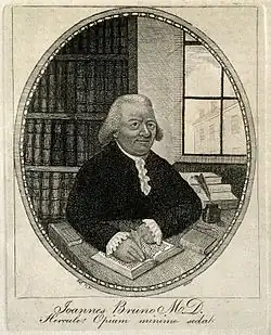 Jacob Friedrich Ludwig Lentin's Medizinische Bemerkungen auf ein literarischen Reise durch Deutschland (1800) talked about German medicine being dominated by the struggles of Brunonians and "anti-Brunonian terrorists."[15] There are also reports of 400 students rioting in a dispute between the two sides in the German university city of Göttingen in 1802.[16] One critic of John Brown's theory was August von Kotzebue, who wrote plays to reflect his disdain for this theory of medicine. In his plays he would portray Brunonianism and doctors who practiced this method in a negative light. Magazines and newspapers in Germany also reflected varying ideas on John Brown's system, some positive and some negative and critical. Röschalub's Magazin would support Brunonian medicine and promoted the system amidst criticisms from other publications at the time. Discussion on John Brown began to cease after 1809 with the end of Röschalub's Magazin. During a typhoid outbreak in 1813–1814 Brown's Brunonian medicine was briefly referenced as Germans attempted to remedy the illness.[7] By 1817, however, the German historian of medicine Kurt Sprengel suggested that Brunonian medicine "has very few supporters."[17] Once again, Brunonian medicine came back in the 1820s, and was in the spotlight again as François-Joseph-Victor Broussais rose to fame. Broussais, a French physician, was becoming very popular in the beginning of the 1820s and his medicinal theory was based on John Brown's own Brunonian medicine. Brown had also become a famous historical figure in Germany by 1846, when Bernhard Hirschel published a study on his system and the effects of Brunonian medicine. However, Brunonianism began to decline as physicians did not believe is adequately provided a scientific explanation to diseases and illnesses.[7]