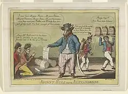A more negative portrayal of John Bull occurred in the cartoons drawn by the Egyptian nationalist journalist Yaqub Sanu in his popular underground newspaper Abu-Naddara Zarqa in the late 19th and early 20th centuries.[6] Sanu's cartoons depicted John Bull as a coarse, ignorant drunken bully who pushed around ordinary Egyptians while stealing all the wealth of Egypt.[6] Much of Sanu's humor revolved around John Bull's alcoholism, his crass rudeness, his ignorance about practically everything except alcohol, and his inability to properly speak French (the language of the Egyptian elite), which he hilariously mangled unlike the Egyptian characters who spoke proper French.[7]