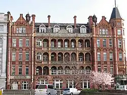 Success brought initially the need for subsidiary sites around London, and then from 1822 a move to premises south of the river, at the junction of Waterloo Road and Stamford Road. The new name was Royal Universal Infirmary for Children, with a foundation stone laid in 1823. Davis's death in 1824 came shortly before the new building was completed. The character of the institution changed in 1856, with annual donations from the Hayles Estate charity (see Walcot Foundation): it admitted inpatients for the first time, and its title increased its scope to "Children and Women".[7] Two further name changes were to Royal Hospital for Women and Children in 1875, and in 1903 when the rebuilt building became he Royal Waterloo Hospital for Children and Women.[8]