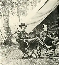Babcock served the entire Civil War. Initially, Babcock volunteered for the Sturgis Rifles as an enlisted soldier in 1861, but he soon was offered a civilian position to be a principal scout for the Army of the Potomac. Babcock became a skilled interrogator of captured Confederates. In 1862, Babcock worked as a Confederate order-of-battle expert with the Topographical Department under Allan Pinkerton and made maps for General George B. McClellan. In one of his reports, Babcock's estimate of enemy forces was off by less than one percent.[2] Early in 1863, Babcock joined the Bureau of Military Information under Colonel George H. Sharpe to gather intelligence. While in this secret service, Babcock provided detailed maps for aeronaut Thaddeus S. C. Lowe, who made frequent balloon flights to obtain tactical intelligence. In 1863, Babcock discovered Robert E. Lee's forward movement, which helped end the Battle of Gettysburg.[3] At the Battle of Appomattox Court House in 1865, Babcock found General Lee under an apple tree and facilitated the surrender of the Confederate States Army.[4] Even though he was a civilian, Babcock was unofficially called "Captain Babcock" and then later "Colonel Babcock".