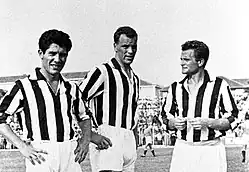 John Charles began his career at Leeds United, having moved there in 1949 from his hometown club, Swansea Town. He was equally adept as a defender or a forward, due to his strength, pace, technique, vision, ability in the air and eye for goal.[5][6] After returning from his National Service in 1952, Charles began to be used more often as a forward, and he was the Second Division's top scorer in 1954. The following year, he was named club captain; in his first season as captain, he led the club to second place and promotion. Charles ended the 1956–57 season as the First Division's top scorer and an eighth-place finish for Leeds. In the summer of 1957, Charles joined Juventus, where he partnered Giampiero Boniperti and Omar Sívori, with the trio becoming known as The Holy Trident. In his five seasons with the club, he won the scudetto three times and the Coppa Italia twice; he was also the capocannoniere winner for the 1957–58 season. In 1962, Charles returned to Leeds, but his time there proved unsuccessful as he was accustomed to the style of play in Italy, and by the end of the year, he had joined Roma. Charles moved back to his native country to play for Cardiff City, and ended his career in non-league football in player-manager roles at Hereford United and Merthyr Tydfil. He was never cautioned nor sent off during his entire career,[7] owing to his philosophy of never kicking nor intentionally hurting opposing players. This led to the nickname he acquired while playing for Juventus, Il Gigante Buono (The Gentle Giant).[6] In 1998, he was included in the Football League 100 Legends, and in 2002, he was one of the inaugural inductees to the Football Hall of Fame.
