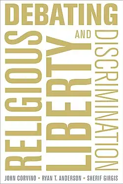 Corvino co-authored Debating Religious Liberty and Discrimination (2017) with Ryan T. Anderson and Sherif Girgis. The book received praise for being a constructive, back-and-forth discussion on religious freedom and anti-discrimination law. Among its positive reviews were those from Russell D. Moore of the Southern Baptist Convention,[18] Albert Mohler of The Gospel Coalition,[18] and Andrea Picciotti-Bayer in National Review.[19] In Commonweal, Robert K. Vischer wrote, "Debating Religious Liberty and Discrimination is a direct challenge to our cultural moment, opting for careful analysis over clickbait, mutual understanding over demonization, and clearly demarcated disagreement over sweeping dismissal. The authors take the time to lay out their best arguments, then respond to the best arguments of their opponents. Whether or not the book ultimately causes readers to change their views is not the measure of its success. The authors provide a desperately needed model for engagement: they argue with, not at their opponent; they argue together."[20]