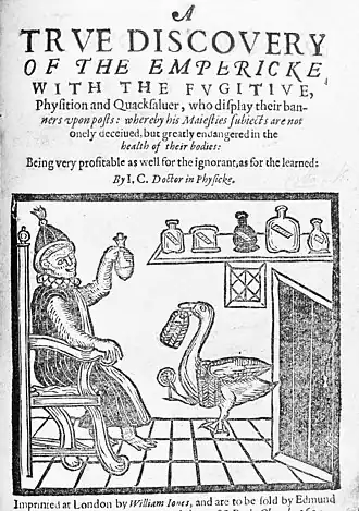 - John Cotta, A true discouery of the empericke with the fugitiue, physition and quacksaluer who display their banners vpon posts: whereby his Maiesties subiects are not onely deceiued, but greatly endangered in the health of their bodies: being very profitable as well for the ignorant, as for the learned: by I.C. Doctor in Physicke., John Cotta, Imprinted at London : By William Iones, and are to be sold by Edmund [Weaver] at the great North doore of S. Pauls Church, 1617.